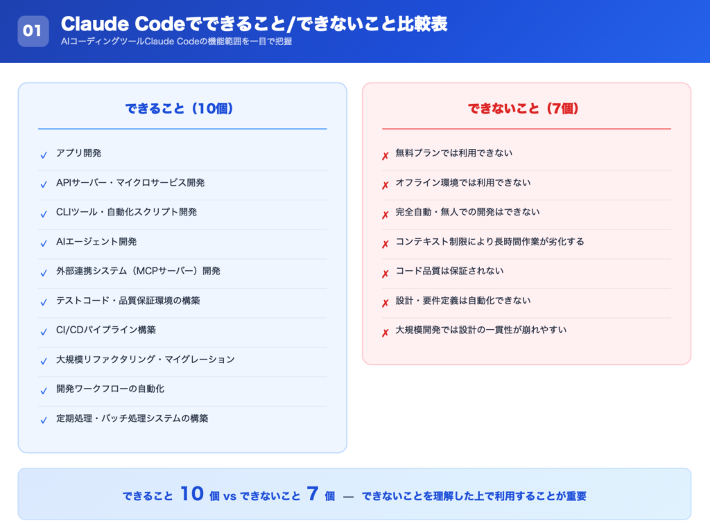 この記事では、Claude Codeで開発できること・できないことを整理し、実務でどのように活用すべきかを分かりやすく解説します。