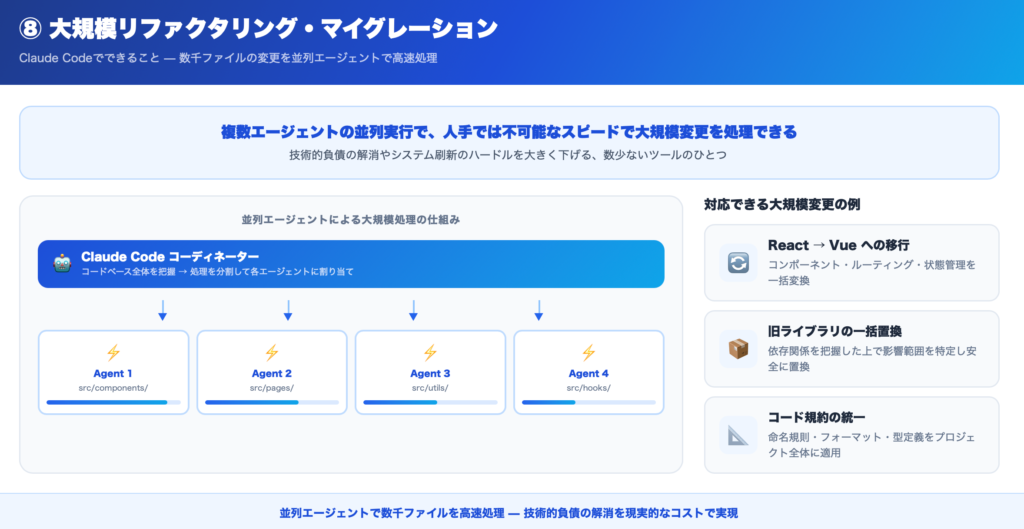 数百〜数千ファイルに及ぶ変更でも、複数エージェントを並列実行することで、効率的かつ高速に処理できます。