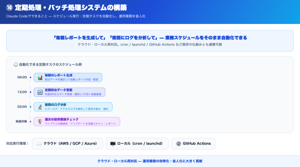 Claude Codeは、スケジュール実行や定期タスクの自動化にも対応しています。