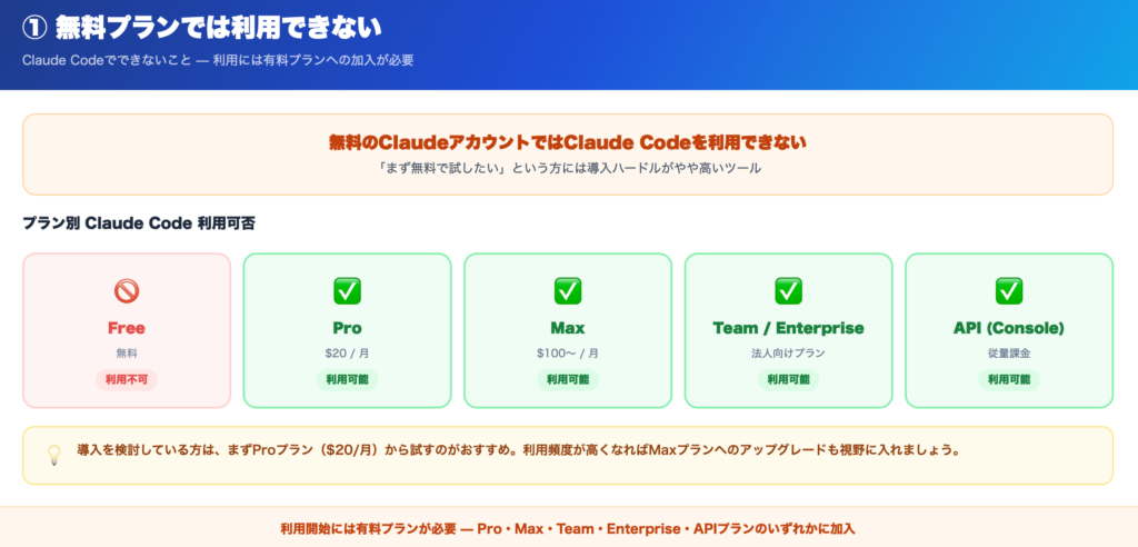 Claude Codeは、無料のClaudeアカウントでは利用することができません。