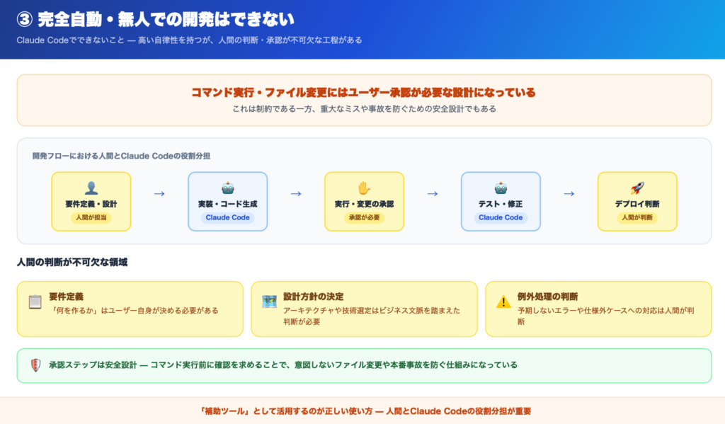 Claude Codeは高い自律性を持っていますが、完全に人間の介入なしで開発を完結させることはできません。