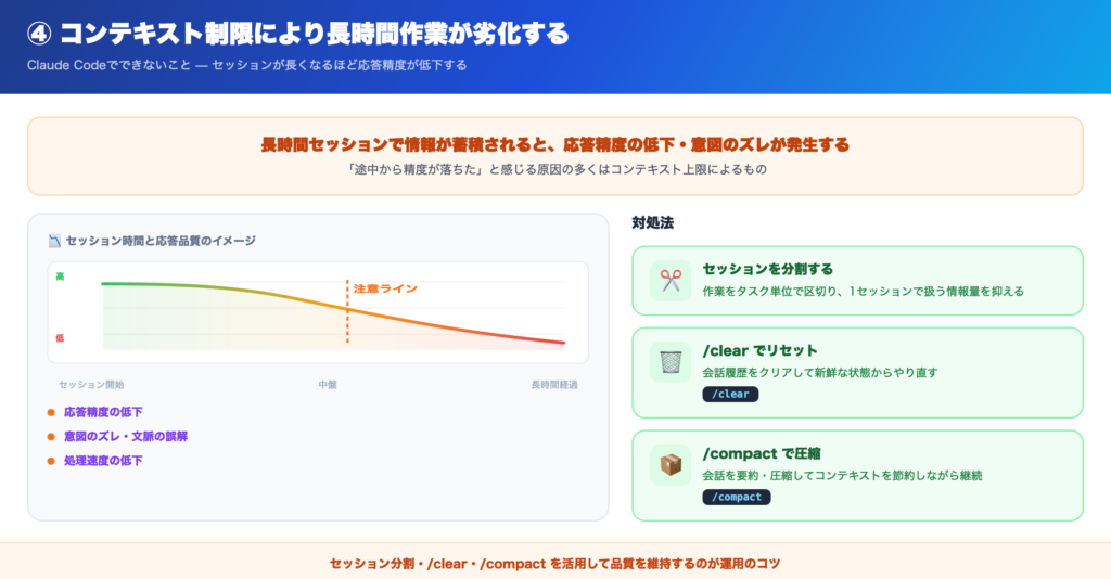 ④ コンテキスト制限により長時間作業が劣化する
