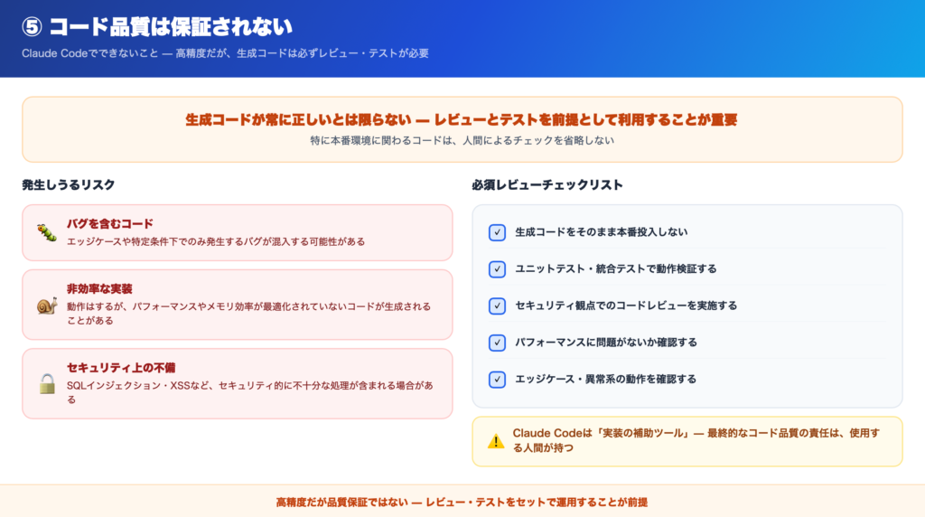 Claude Codeは高精度ですが、生成されるコードが常に正しいとは限りません。
