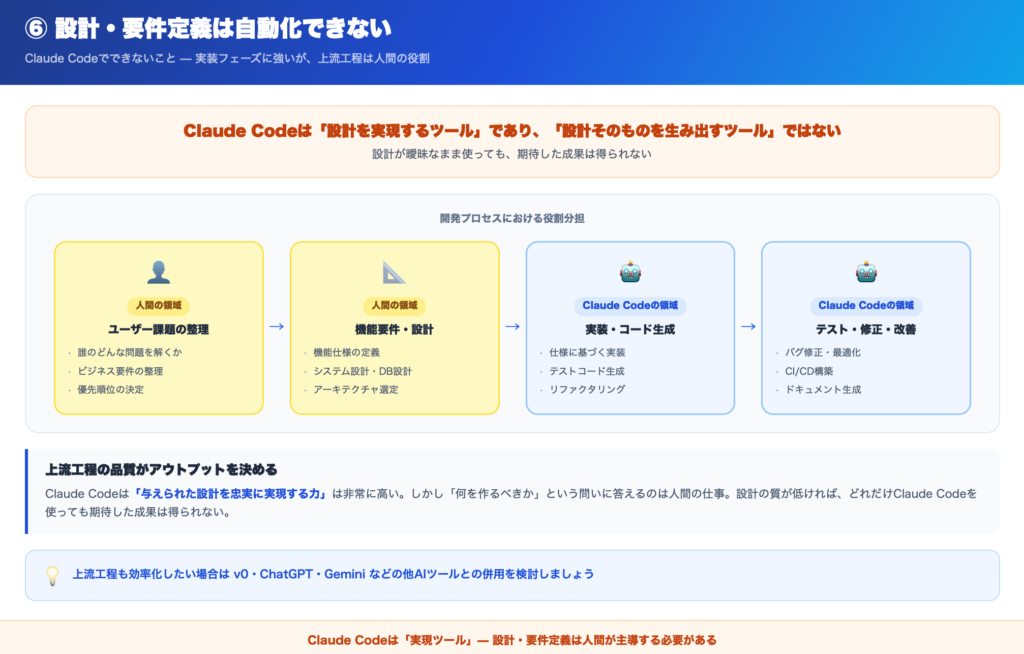 Claude Codeは「設計を実現するツール」であり、「設計そのものを生み出すツールではない」という理解が重要です。