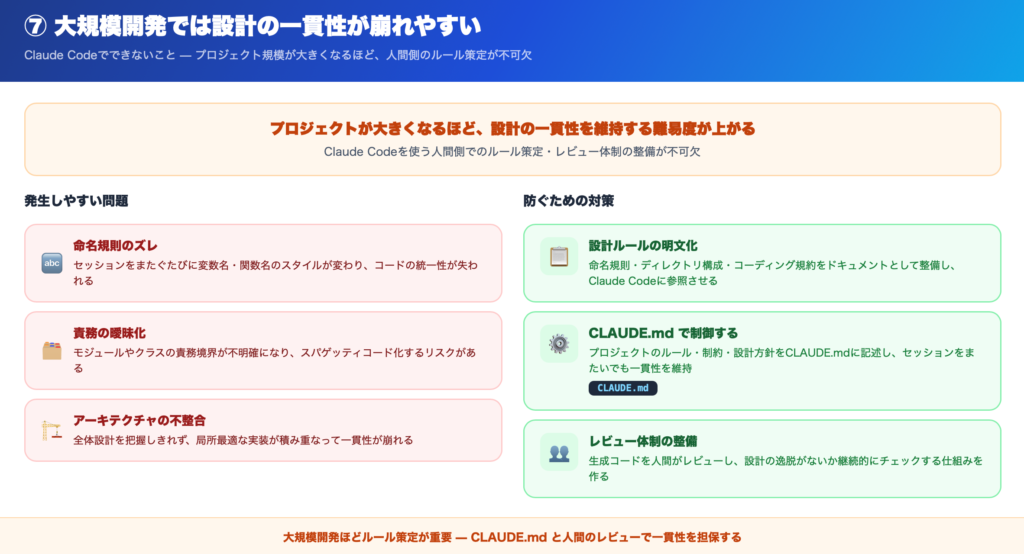 Claude Codeは大規模なコード変更にも対応できますが、プロジェクトが大きくなるほど、設計の一貫性を維持する難易度が上がります。