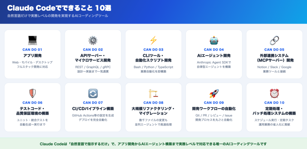 Claude Codeでできること10選、できないこと7選をそれぞれ順番に解説します。