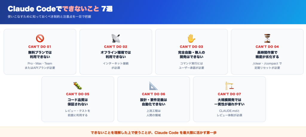 Claude Codeは非常に高性能なツールですが、「なんでもできる」というわけではありません。