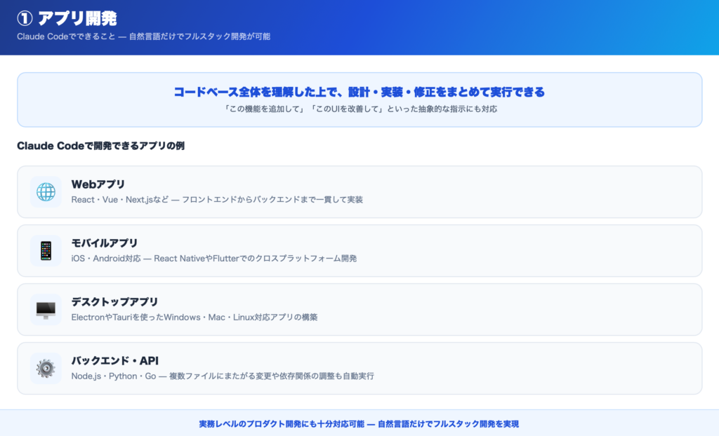 Claude Codeは、Webアプリ・モバイルアプリ・デスクトップアプリなど、あらゆるアプリケーション開発に対応しています。