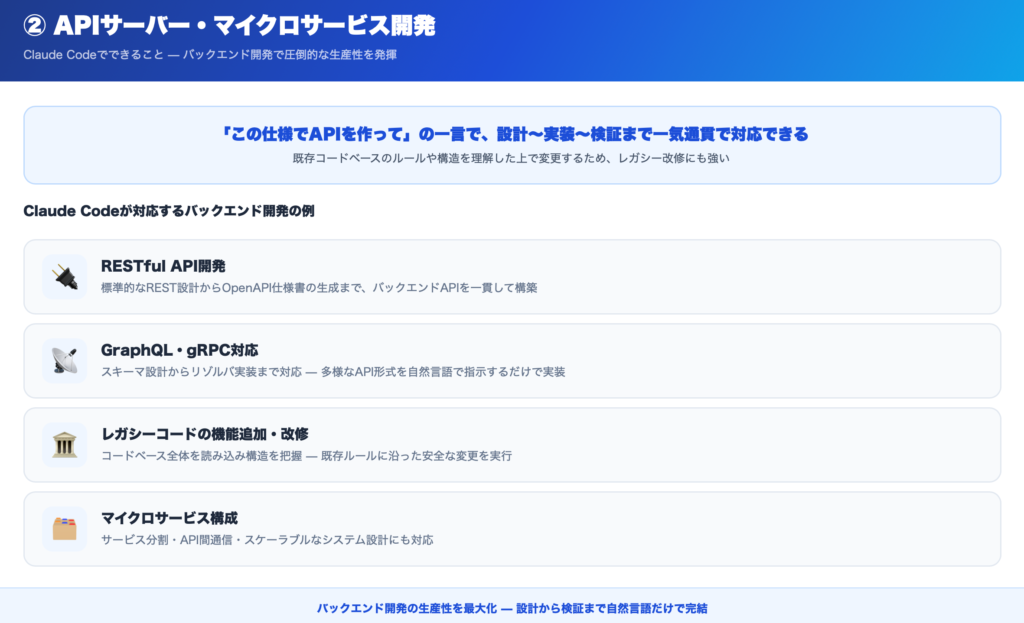 Claude Codeは、バックエンド開発において非常に高い生産性を発揮します。