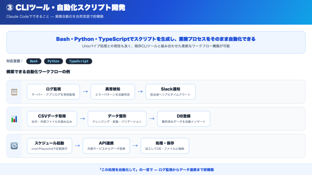 Claude Codeは、CLIツールや業務自動化スクリプトの開発にも非常に適しています。