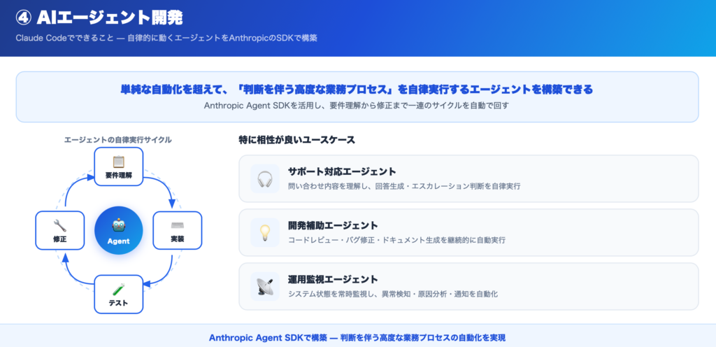 Claude Codeは、単なるコード生成を超えて、自律的に動くAIエージェントの開発にも対応しています。