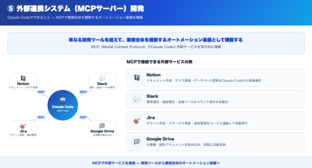 MCP(Model Context Protocol)を活用することで、Claude Codeと外部サービスを接続するシステムを構築できます。