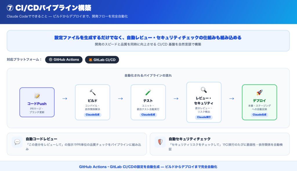 Claude Codeは、CI/CDパイプラインの構築・改善にも対応しています。