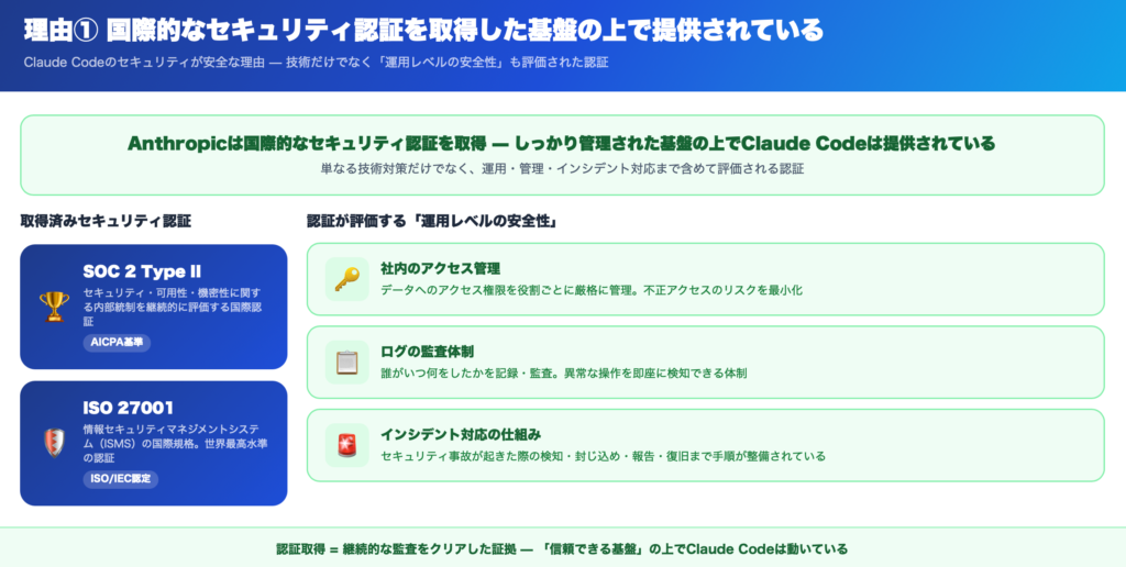 つまりこれらの認証を取得しているClaude Codeは、しっかり管理されたセキュリティ基盤の上で提供されているツールだと言えます。