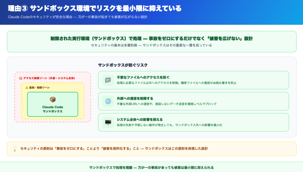 Claude Codeは、クラウド上で動作する際に、制限された実行環境(サンドボックス)の中で処理されます。
