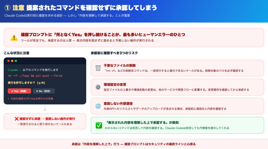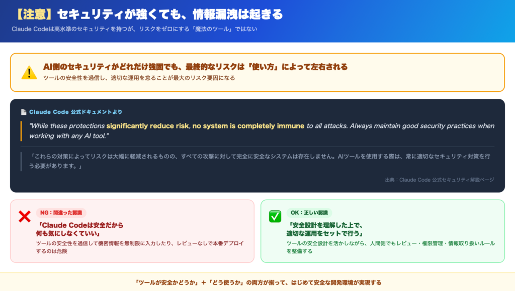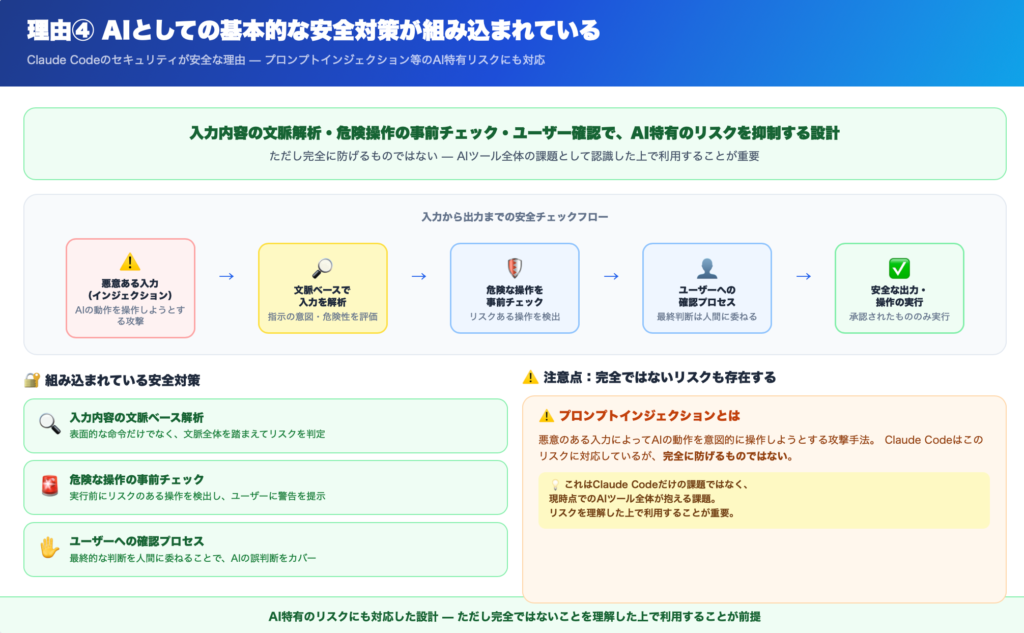 ただし、このAI特有のリスク分野は、Claude CodeのみならずAIツール全体の課題でもあるため、完全に防げるものではないという前提は理解しておく必要があります。
