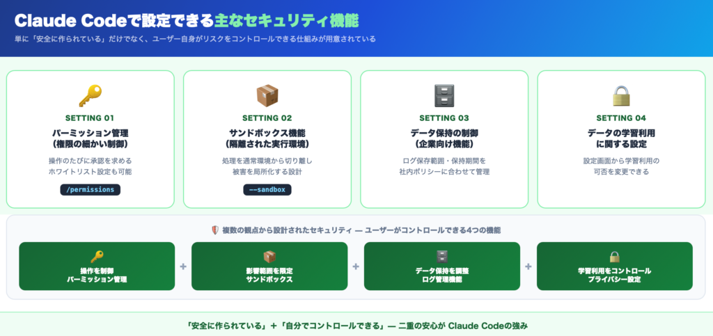 Claude Codeには、ユーザー自身がコントロールできるセキュリティ機能がいくつか用意されています。