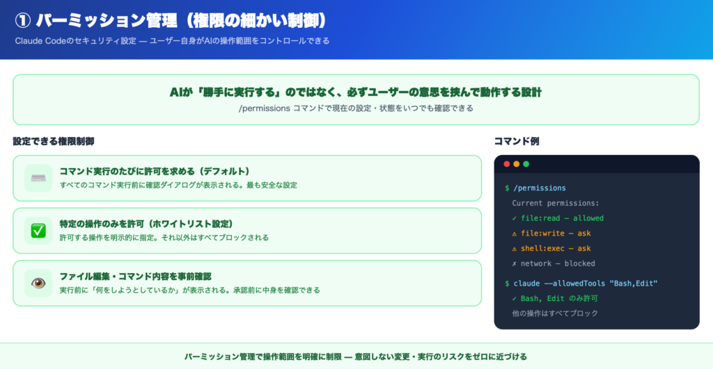 Claude Codeでは、AIの操作をユーザーが制御できるように、パーミッション(権限)ベースの仕組みが採用されています。