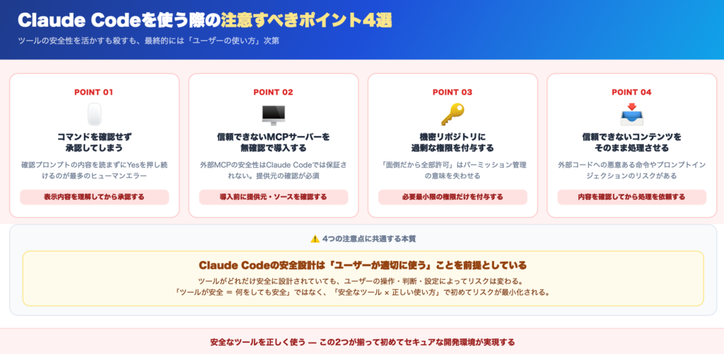 ここまで見てきた通り、Claude Code自体は高いセキュリティを備えたツールです。