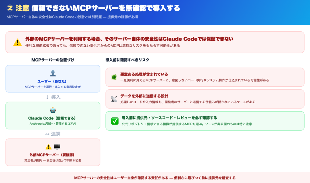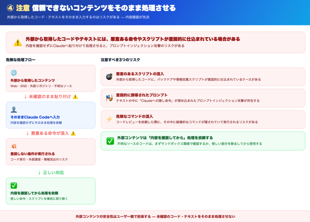 外部から取得したコードやテキストを、そのままClaude Codeに処理させるのも注意が必要です。