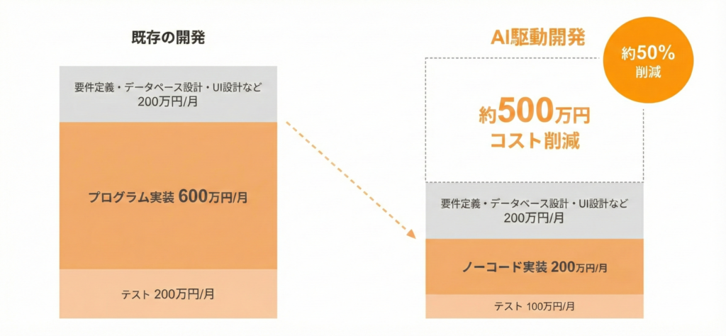 たとえば、従来であれば1,000万〜2,000万円程度かかっていた開発が、AI駆動開発では500万〜1,000万円前後に収まるイメージです。