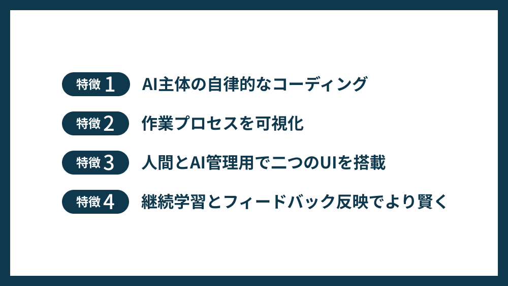 といった一連の開発プロセスを、自律的にこなせる点が大きな特徴です。