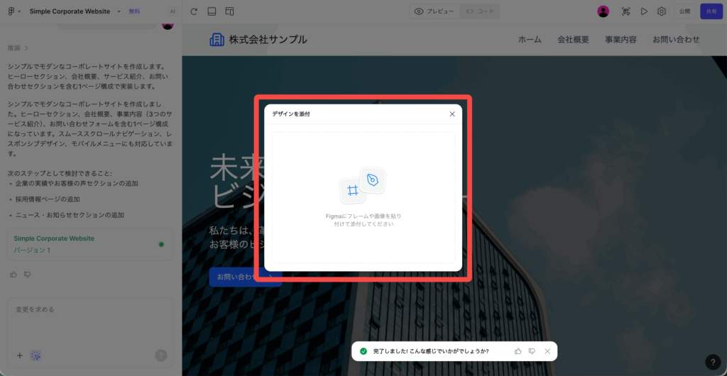 添付したデザインはレイヤー構造や内容を解釈したうえでコードに変換され、プロンプトの指示と合わせて結果に反映されます。