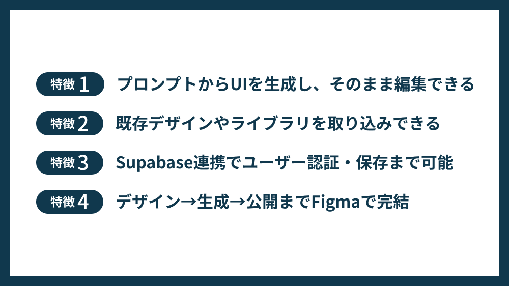 アイデアを文章で伝えるだけでレイアウトやインタラクションが自動生成され、さらに会話を重ねるだけでUIを反復的に調整でき、Figmaのワークフロー上で「発想→作成→検証→公開」までを一気通貫に進められるのが核となる価値になっています。
