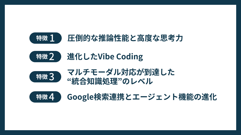 Gemini 3で最も注目されているのが、飛躍的に向上した推論性能です。複雑な要素が入り混じった問題を整理し、背景にある文脈や意図まで読み取ったうえで答えを導き出す“深い思考力”が備わっています。