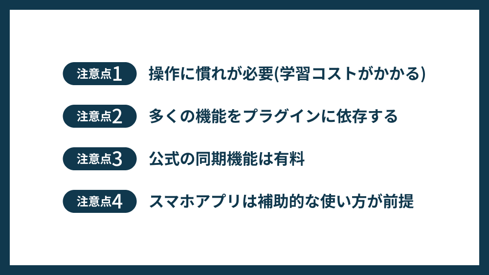 多機能で柔軟なObsidianですが、すべての人にとって完璧なツールというわけではありません。