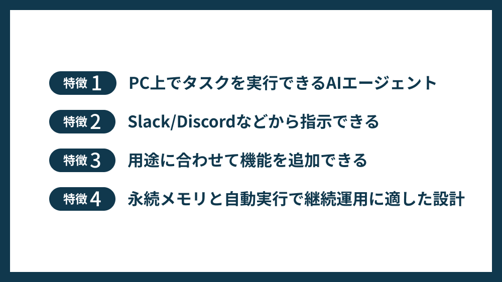 チャット型AIのように回答を返すだけでなく、ファイル操作・コマンド実行・ブラウザ操作などを実行レベルで肩代わりできる点が注目されています。SlackやDiscordなどのチャットを指示窓口として使えるため、社内の依頼フローに組み込みやすく、業務自動化を段階的に進める導線を作りやすいのも特徴です。