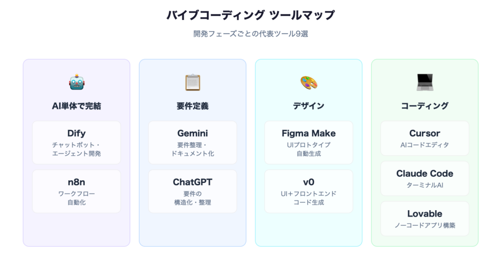 バイブコーディングを効率的に進めるためには、目的に合ったツール選びが重要になります。