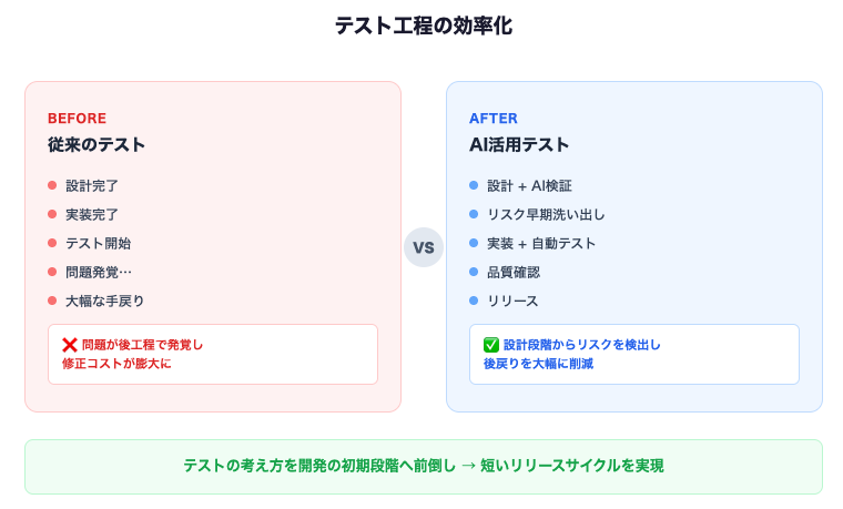 AIを活用すると、設計段階から複数の実装案を比較したり、影響範囲を洗い出したり、潜在的なリスクを指摘させたりすることが可能になります。つまり、テストの考え方を開発の初期段階へ前倒しできるようになります。