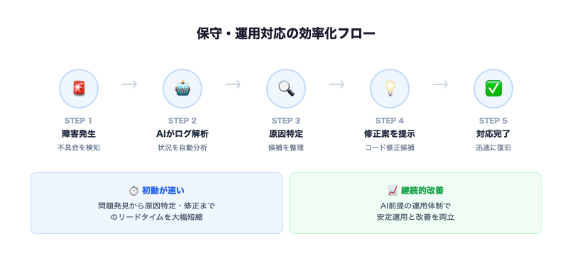 これにより、問題の発見から原因特定、修正対応までの初動が速くなり、システム停止時間や影響範囲を最小限に抑えやすくなります。AIを前提とした運用体制を整えることで、継続的な改善と安定運用の両立がしやすくなる点も大きな特徴です。