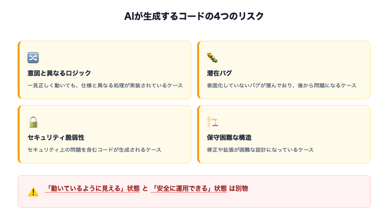 バイブコーディングは強力な開発スタイルですが、万能ではありません。AIは一見正しく動くコードを生成できても、その内部には問題が含まれている可能性があります。