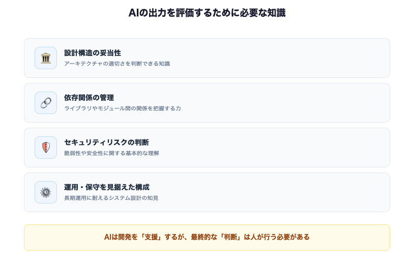 小規模なツールや個人用途であれば成立する場合もありますが、システムの規模が大きくなるほど、AIの出力を評価するための基礎知識が求められます。