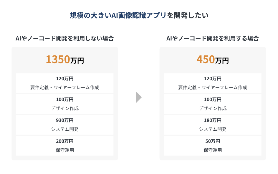 AI画像認識アプリの8割はAIやノーコードでも十分に開発可能であるため、最初はコストを削減できるAI・ノーコードで開発可能か検討するのがおすすめです。