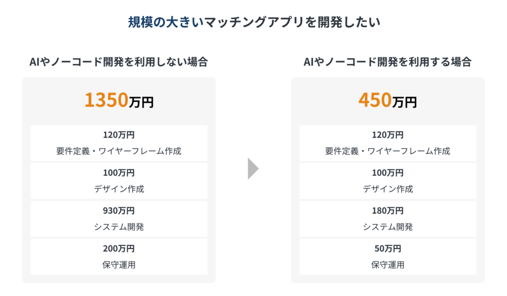 しかし、「AI・ノーコード開発×補助金利用」で約80%の費用削減が可能です。