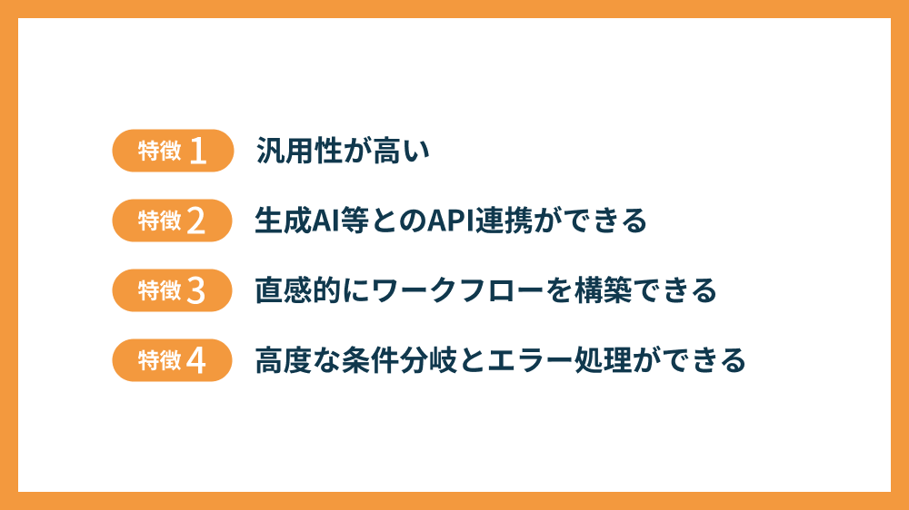 視覚的なインターフェースで複雑なワークフローを構築できるだけでなく、AIやAPIとの柔軟な連携により、他の自動化ツールでは再現しづらい高度な処理も実現可能です。