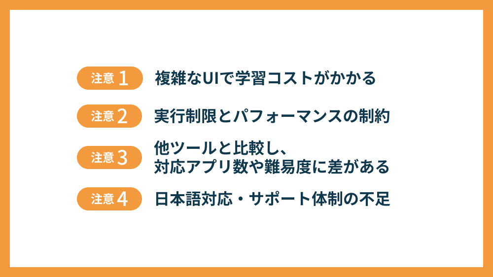 柔軟に利用することができるMakeですが、利用にあたっていくつか注意すべき点も存在します。利用前に以下のデメリットを把握しておきましょう。